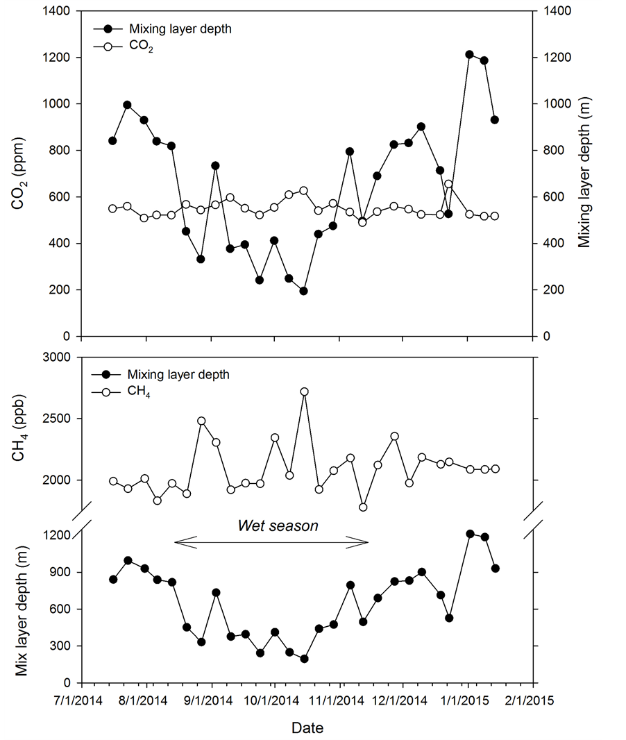 When this analysis is applied to CH4, the corresponding mixing ratios seems to be influenced by the mixing layer depth too (Figure 7). The peak-to-peak amplitude of the variation in the concentration of CH4 is 941 ppb