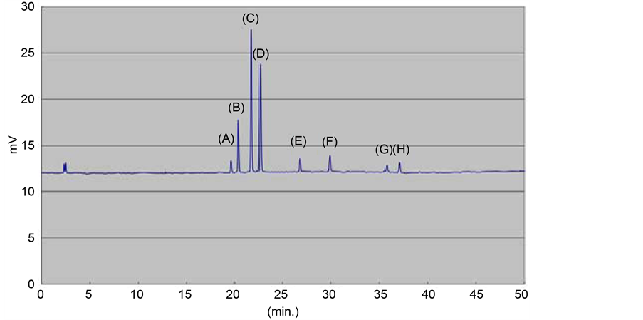 Figure 1. HPLC Chromatogram of Thomsonide. (A) 6-hydroxygenistein 6, 7-di-O-glucoside; (B) Glycitin; (C) Tectorigenin 7-O-xylosylglucoside; (D) Tectoridin; (E) Glycitein; (F) Tectorigenin; (G) Soyasaponin I; (H) Kaikasaponin III.
