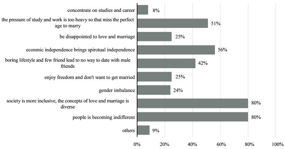 As to the reason for becoming “leftover women”, the majority selected that “society is more inclusive, the concepts of love and marriage is diverse”, “people is be-coming indifferent”, “economic independence brings spiritual independence” and “the pressure of study and work is too heavy so that miss the perfect age to marry”. For the different reasons for becoming “leftover women”, scholars try to classify it (see Figure 2). According to the survey, “society is more inclusive, the concept of love and marriage is diverse” and “people is becoming indifferent” are the main attitude of the surveyed people. At the same time, economic independence as well as employment also is important to solve this serious social phenomenon.