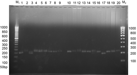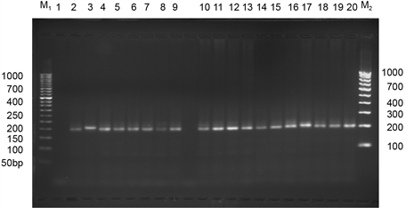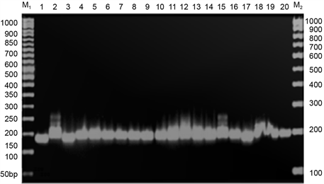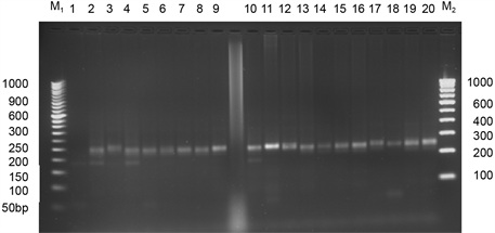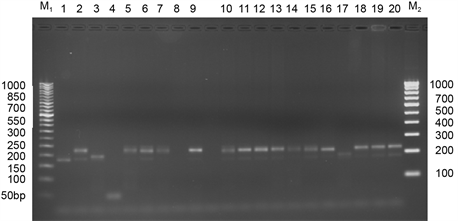 Figure 1. SSR profile of twenty chilli genotypes using primer (a) CAMS-117, (b) CAMS-153, (c) GPMS-161, (d) EPMS-418 & (e) CAMS-806. M1: 50 bp DNA ladder and M2: 100 bp DNA ladder. Lane 1 Pop-1; 2: Pop-2; 3: Pop-3; 4: Pop-4; 5: Pop-5; 6: Pop-6; 7: Pop-7; 8: Pop-8; 9: Pop-9; 10: Pop-11; 11: Pop-12; 12: Pop-13; 13: Pop-14; 14: Pop-15, 15: Pop-16; 16: Pop-17; 17: Pop-18; 18: Pop-19; 19: Pop-20 and 20: Pop-21.