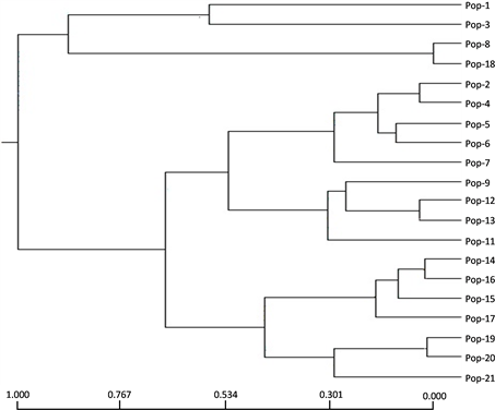 The values of similarity coefficient were computed from combined data for the five primers, ranged from 0.00 to 1.000. The highest genetic identity (1.00) was observed in Pop-2 vs Pop-18; Pop-3 vs Pop-5 vs Pop-19 vs Pop-20; Pop-4 vs Pop-18 vs Pop-19; Pop-13 vs Pop-14 vs Pop-15 vs Pop-16 vs Pop-18; whereas lowest genetic identity (0.00) was observed in Pop-8 vs Pop-18. The second largest genetic identity was 0.997 and they were present in Pop-4 vs Pop-20 and Pop-13 vs Pop-20 (Table 3). The difference between the highest and lowest
