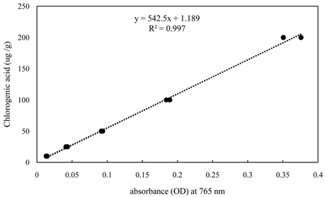 The Folin-Ciocalteau’s colometric method [30] , with some modifications, was used for phenolic compound analysis. In order to calculate the concentrations of phenolic compounds in the samples, a standard curve was first made using a solution of 2 mg/ml chlorogenic acid in methanol with 5 concentrations: 0, 10, 25, 50, 100 and 200 µg/ml, diluted in 5% ethanol (Figure 1). For the total phenolic analysis, 12 µl of the diluted sample extracts or chlorogenic acid solutions were loaded directly into a TC-plate and mixed with 50 µl 18.2 Millipore water. Twelve µl Folin-Ciocalteau’s reagent (SIGMA) was added and the mixture was allowed to react for 6 min before adding 125 µl of 7% (w/v) Na2CO2. The samples were left to stand at room temperature for 75 min before measuring the absorbance at 765 nm on the spectrophotometer. Total phenolic content (TPC) was expressed as chlorogenic acid equivalents in µg/g of sample dry weight (µg/g DW).