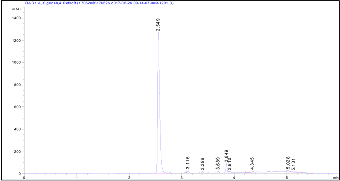 No ellagic acid was detected in any of the samples of the species tested, however the chromatograms showed presence of other unidentified biochemical compounds that were similar in all the species but of varying amounts. All other species had peaks similar to the one obtained from H. filiformis (Figure 2). Yang et al. [25] , reported that ellagic acid was found in H. filiformis, however, Hillis [26] reported that ellargic acid is not present in monocotyledons and that previous reports of its presence were probably “erroneous”. To evaluate if ellargic acid is present in corms of Hypoxis, or not, we analyzed the 7 species. Our results partially confirm the report by Hillis, as the compound was not found in corm extracts of H. filiformis or in any of the other Hypoxis species that we tested, other plant parts were not tested for the presence of the compound. The light spectra images obtained from the highest peaks in the samples were compared with the light spectrum image of ellagic acid obtained from the standard sample.