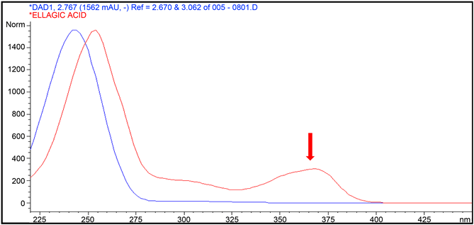 Figure 3. Light spectra images of ellagic acid from the ellagic acid standard (red) and an unidentified compound (blue) from the corm extract of H. filiformis (also found in abundance in all of the Hypoxis species tested). Arrow shows the special characteristic of ellagic acid that is not present in the other image.