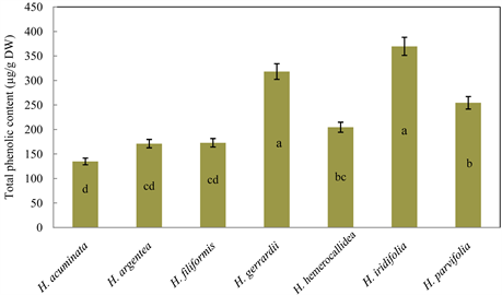 Figure 4. Total phenolic content in the corms of seven species of Hypoxis. Different letters in the bars indicate a significant difference in total phenolic content.