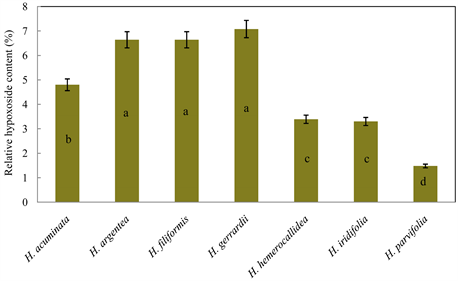 and H. filiformis had the highest relative hypoxoside contents of 7.1%, 6.6% and 6.6%, respectively (Figure 6). The second highest hypoxoside content (4.8%) was obtained from H. acuminata whilst H. hemerocallidea and H. iridifolia had similar proportions of 3.9% and 3.3%, respectively. H. parvifolia had the least hypoxoside content with a relative content of 1.5%. These results show a distinct difference in the amount of the compound found in each species. Whilst it was not possible to quantify the absolute hypoxoside content detected from the extracts due to the absence of a pure hypoxoside standard, the HPLC chromatograms gave a clear indication of its presence and proportion in the different species.