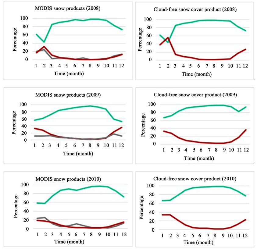 Figure 5. Comparison of MODIS snow products with cloud-free snow cover products (red line shows snow; green line shows non-snow; grey line shows cloud).