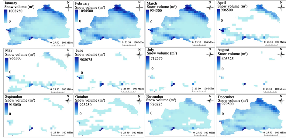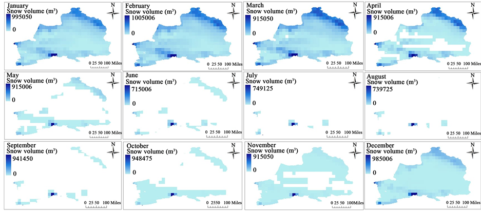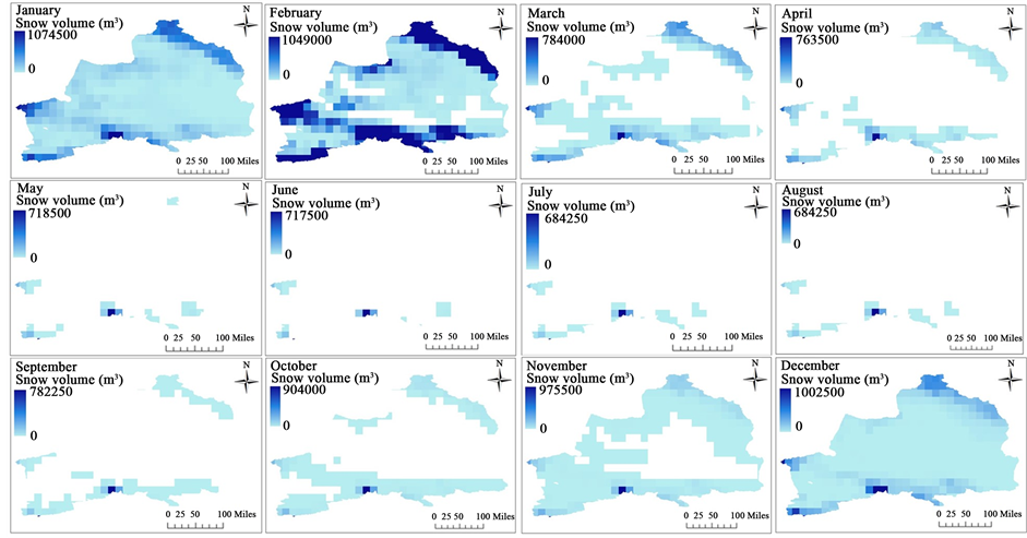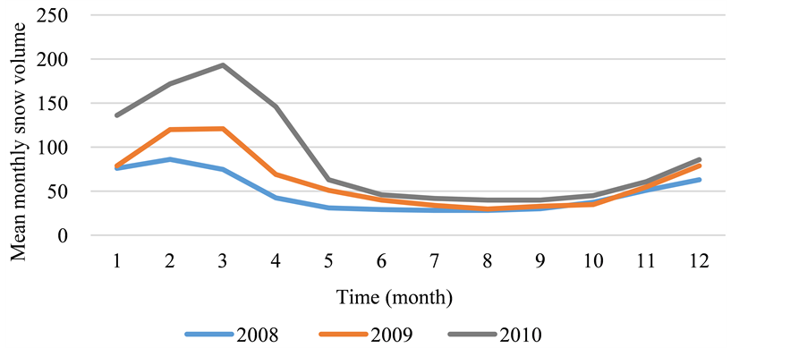 Outputs presents that the total snow volume of 2008 and 2009 is lower than the total snow volume of 2010 (Figure 6). The time variation of the snow volume is almost dominated by the seasonal cycle. Results show that the mean annual snow volume over the whole study is domain equal to (48) km3, (60) km3, and (89) km3 over this three year time period, respectively. The mean monthly snow volume ranges from about 38 × 109 m3 in summer to about 104 × 109 m3 in winter. The serious snow volume from December to March, accounted for 80% of the total snow volume. From November to March, snow volume was increasing (this season called snow accumulation season), this heavy snow accumulation leads to snow disasters, such as snow avalanches, snow drifting, etc. From March to June, snow volume was decreasing (this season called snow melting season), this type serious snow melting may occurred floods, name as snow-melt flood. In addition, serious snow volume change mainly concentrated on Altay, Tacheng, and Ili regions. The monthly variation of snow volume time series over the study area during January 2008 and December 2010 are shown Figures 7-9.