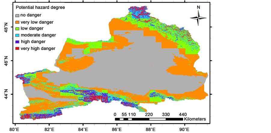 Figure 10. Potential hazard map for snow avalanche prevention in north Xinjiang.
