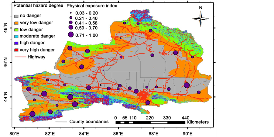 Growing exposure and delays in reducing vulnerabilities result in an increased number of natural disasters and greater levels of loss. In present paper, snow avalanche risk were analyzed using physical exposure and vulnerability indexes, which including population density, livestock number at the end of year, and highway network (Figure 11). They reflect the risk assessment of snow avalanches on the north Xinjiang.