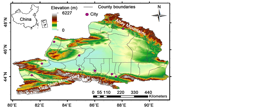 The northern part of Xinjiang Uyghur Autonomous Region (hereafter called north Xinjiang) located on north- western China was selected as a case study area (Figure 1). The extreme minimum temperature may reach −40˚C and the mean duration of snow cover is about 130 days per year, generally from the middle of November