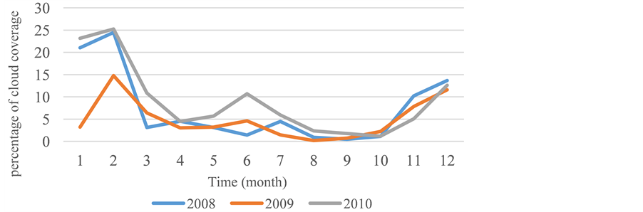 Figure 2 displays the monthly cloud-cover percentage for four selected years in northern Xinjiang. The maximum cloud coverage is mainly concentrated during winter months (The percentage of cloud coverage mainly concentrated on winter season). The overall mean cloud-cover percentage in winter months varies from 20% for 2008, down to 10% for 2009, increase to 20% for 2010, and over 22% for 2011. It significantly limits the ability to map the exact number of snow-covered days. However, when aiming at snow-cover extent analyses over time, a cloud-free time series is a major prerequisite.