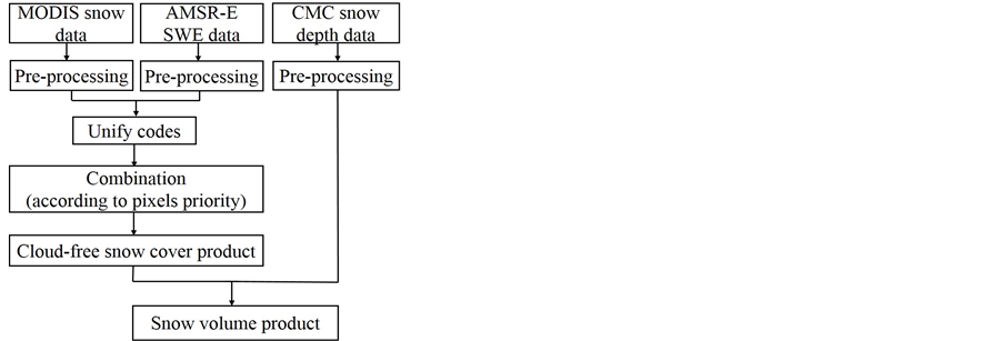 the advantage of all-weather imaging but a much coarse resolution. The algorithm which for merging two re- mote sensing products (utilizing MODIS snow cover products and AMSR-E SWE products) with complementary spatiotemporal resolution characteristics is taken to generate cloud-free snow cover products, similar to Gao et al. (2010) [9] . A method consists of unifying codes, combing products. 1) Unifying codes: The original integer numbers in the MODIS and AMSR-E products were then transformed to new codes and used for the combination processes. 2) Combining products: replace the remaining cloud or other contamination of MODIS using the value of AMSR-E Snow Cover image. According to the definition of snow volume, snow volume product generated from multiplication of cloud-free snow-covered area with snow depth.