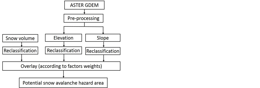Potential hazard map is produced through spatial data process operation (Figure 4). For each evaluation factor, reclassification system is required. Moreover, overly calculation over all of evaluation factors’ data need to be executed so that the score of each study unit’s snow avalanche danger could be calculated and then danger grade could be made according to operation system. Detail explanation about the step that how to perform weighted sum analysis are: