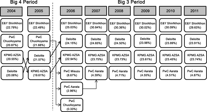 In April 2005, one client of ChuoAoyama―the PwC affiliated audit firm in Japan―committed the then largest accounting fraud in Japan [1] . In an effort to restore its reputation, PwC splits ChuoAoyama into two firms in May 2006: Misuzu and Aarata. Misuzu was later dissolved in 2007 because one of its clients was involved in an accounting fraud. Aarata continues to operate as a smaller and high-quality PwC affiliate in Japan. The market exit of both PwC Misuzu and PwC ChuoAoyama reduced auditor choice for Japanese clients which have significant implications for auditor competition. Although Big 4 audit firms still hold the largest audit share in Japanese market as a group, the 2007 total audit fee income data revealed that PwC Aarata (PwC ChuoAoyama successor firm)’s market share is less than one-third of the third largest Japanese Big 4 affiliated firms [2] . This event significantly changed the structure of the Japanese large audit market from the Big 4 period (2004-2005) to the Big 3 period (2006 onwards). There is a significant concern that Japanese audit market is becoming less competitive following such a significant market disruption, which is commonly caused by a merger or exit of one of Big N1 auditors. When one of the Big N auditors leaves the market, the issue of auditor concentration becomes more important as large listed companies have more limited choices for audit service.