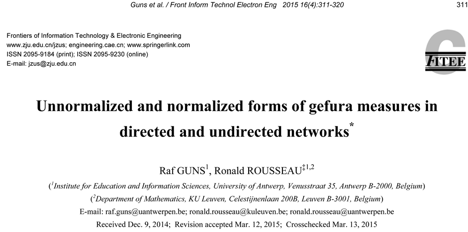 In the latest issue Vol. 16, No. 4 (April 2015), the journal Frontiers of Information Technology & Electronic Engineering published a paper entitled “Unnormalized and Normalized Forms of Gefura Measures in Directed and Undirected Networks” [1] from the scientometrician Ronald Rousseau and his team. Because of similar research direction, we have the chance to study more about the process how the authors proposed and designed their research on gefura measures. Here, I would like to recommend this research work to the readers from the community of complex networking and related fields.