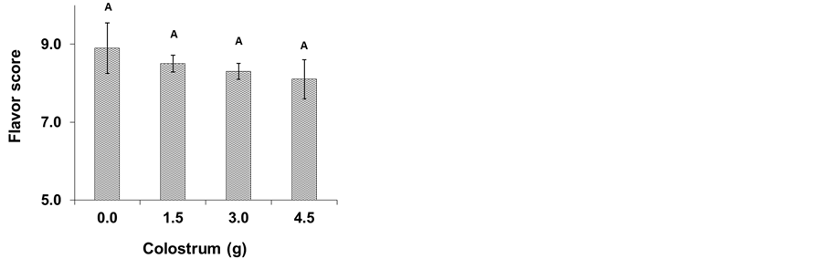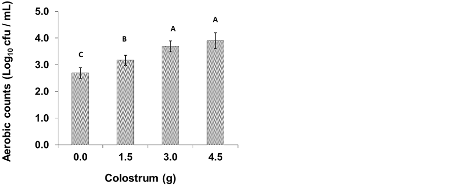 The aerobic counts are reported in Figure 1. The ice creams with colostrum had significantly higher aerobic counts that the control. With an increase in colostrum up to 3.0 g/pint of ice cream the aerobic counts increased. Microorganisms are known to be associated with milk powders. Microbial content of milk powders is one of the criteria that influence grading of milk powders [7] . Colostrum was added in form of colostrum powder which was also source of microorganisms, hence an increase in colostrum used resulted in increase in aerobic counts. Although there was an increase in aerobic counts, the counts were within the legal limits for ice cream [8] .
