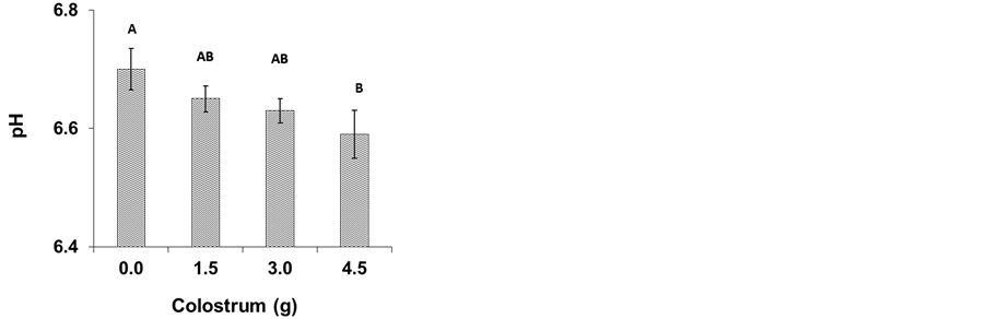The pH values are shown in Figure 2. Use of 4.5 g of colostrum resulted in significantly lower pH compared to control. This may be because colostrum powder used had 23% lactose (manufactures specification) hence the ice cream mixes with the most amount of colostrum would have had more lactose compared to the control (no colostrum). Within the ice cream mix there are indigenous lactobacilli [9] which ferment lactose to lactic acid lowering the pH [10] .