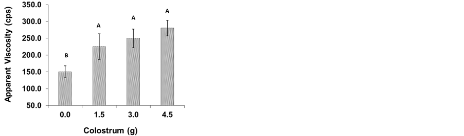 The apparent viscosity values are reported in Figure 3. With colostrum incorporation the apparent viscosity was significantly higher when compared to the control. By incorporating colostrum there is an increase in total solids which in turn would increase product viscosity.
