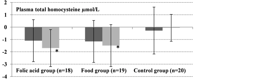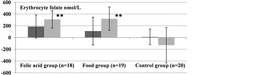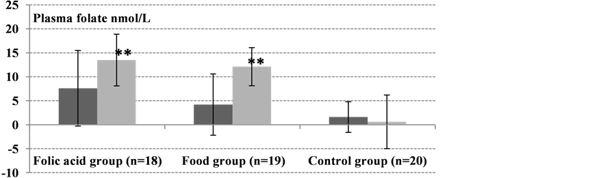 Figure 1. Absolute changes from baseline (day 0) to 8 weeks (dark gray bars) and 12-weeks (light gray bars) in erythrocyte folate, plasma folate, and plasma tHcy (all were normally distributed). Values are means ± SD. Significant differences in absolute changes between each active group, the food group (n = 19) and folic acid group (n = 18), and the control group (n = 20) were determined using Student’s t-test. No significant changes in erythrocyte folate, plasma folate, and plasma tHcy concentrations were observed from day 0 to 8 and 12 weeks in the control group (*P < 0.01, **P < 0.001).