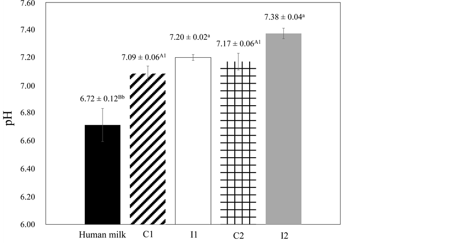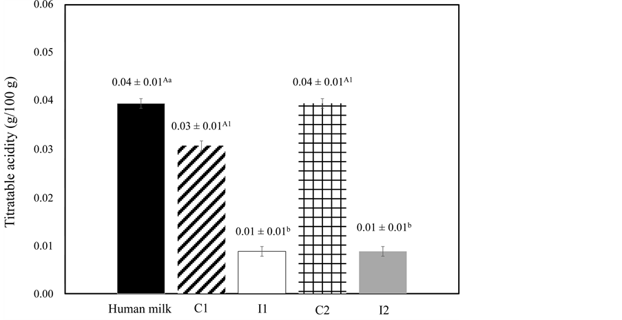 Regarding the pH results, no differences (P < 0.05) were observed between C1 and C2 samples, and I1 and I2 samples, respectively. However, when these values were compared with human milk, it was possible to note that lower value (P < 0.05) was obtained for the human milk. According to Cavalcante et al. [32] , those values may vary between 5.47 and 7.84 and depend on the week of lactation and the lipids present. The same authors affirm that human milk can be considered as food that is initially little basic, becoming slightly acidic (up to the 21st day after birth) and then stabilizing between neutral and slightly basic (up to 180 days after birth). In light of the foregoing, the results observed for pH in this study are within the acceptable parameters.