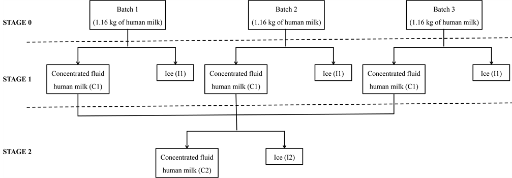 The freeze concentration methodology applied to the human milk was the block freeze concentration, described by Boaventura et al. [23] . The method is based on total freezing of human milk followed by a partial defrosting procedure under simple gravitational separation. This method makes it possible to obtain two fractions denoted as concentrated fluid human milk (C) and ice (I) (Figure 1). An initial weight of 3.48 kg of human milk was divided into three batches of 1.16 kg and then frozen at −20˚C ± 2˚C in a freezer unit (Electrolux, FE 18, São Carlos, Brazil) by indirect cooling. Once the human was frozen, 50 % of the initial weight was defrosted at room temperature (20˚C ± 2˚C). The total defrosted liquid obtained (1.74 kg) was the concentrated fluid human milk of the first freeze concentration stage (C1). C1 was also frozen at −20˚C ± 2˚C and defrosted (20˚C ± 2˚C) up to 50% of the weight (0.87 kg) and it was the concentrated fluid