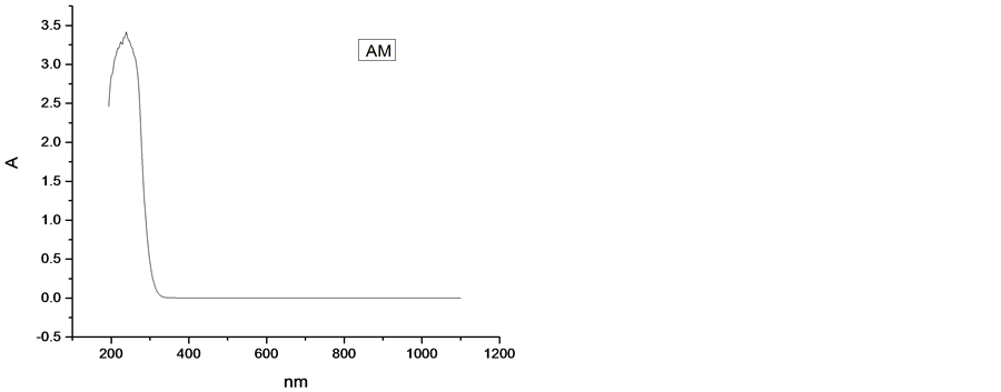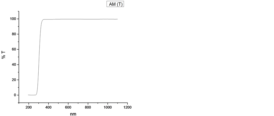 The UV-VIS-NIR absorption and transmission spectra were recorded in the range between 190 nm to1100 nm. The observed spectra are shown in Figure 4 and Figure 5. From the observed spectrum, the lower cut-off wavelength is found to be 238 nm and there is no absorption in the visible region and near infrared region. All amino acids possess the property, that the absorption of radiation is absent in the entire visible region [13] [14] . The absence of absorption in this region provides as the source for second harmonic generation. Thus, the absorption studies reveal that the crystal L-Arginine maleate dihydrate acts as a suitable material for second harmonic generation in the visible and near infrared regions.