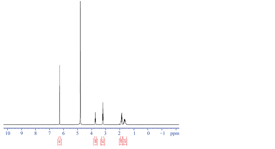 The resonance peaks at δ = 1.629 ppm and at δ = 1.889 ppm in the 1H-NMR spectrum is due to the CH2 group of L-Arginine. The spectrum shows two peaks at δ = 3.201 ppm and δ = 3.717 ppm corresponds to the CH2 and CH groups of L-Arginine. The resonance peak observed at δ = 6.285 ppm exhibits the presence of CH2 methy-