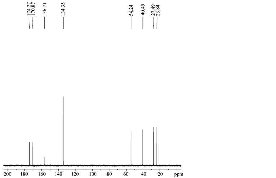 The 13C-NMR spectrum of L-Arginine maleate dihydrate contains eight signals. The resonance peaks at δ = 174.27 ppm and δ = 170.81 ppm is due to the carboxylic groups of L-Arginine and maleic acid. The resonance signal observed at δ = 156.71 ppm is due to the carbon attached to HN=C−NH2 group. The carbon attached to amino group shows its resonance peak at δ = 54.24 ppm. The peaks at δ = 40.45 ppm, δ = 27.49 ppm and δ = 23.84 ppm are due to the carbon environments of CH2 groups of L-Arginine. The CH group of maleic acid gives