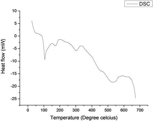 The DSC curve shown in Figure 9 reveals that the endothermic peak at 107˚C is assigned to the decomposition of the material which is also evident in the DTA curve. Further, endothermic peaks were due to the volatilization of the compound observed during the decomposition stages which matches with the TG/DTA curves.