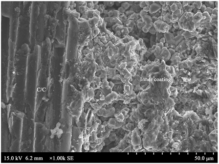 Cross-section images of SiC/SiC coated composite are shown in Figure 4. A good adhesion between the inner coating and the substrate is found due to reaction between Si powder and C/C substrate. The outer coating is well bonded with the inner coating due to no thermal mismatch between them, as shown in Figure 4(b).