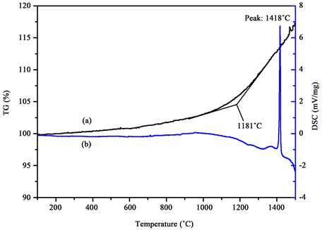 The thermal behavior of the SiC/SiC coating under air has been measured by TG-DSC. The corresponding TG-DSC curves are shown in Figure 5(a) and Figure 5(b), respectively. A gradual weight gain is observed on heating to 1181˚C due to the ambient SiO2 layer on the surface of SiC/Si, which reduces the oxidation rate of SiC/Si to a very low speed. Above this temperature, the diffusion rate of oxygen from air to SiC/Si promotes and an obvious weight gain is