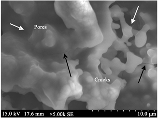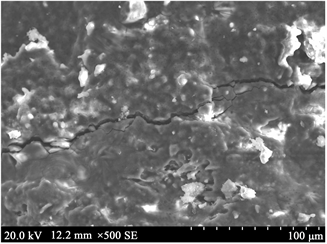 Figure 7 shows the SEM images of the coated composites after oxidation at 1600˚C in air for different time. For SiC coated C/C composite, when oxidation at 1600˚C for 36 h, as shown in Figure 7(a), the particles are invisible and covered by vitreous SiO2 due to the oxidation of SiC. So the coating surface becomes smoother and denser. However, vitreous SiO2 is not in sufficient quantities to seal cracks. Therefore, a long and deep crack is found in SiC coating due to