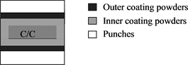 Raw materials used for inner SiC coating were Si (200 mesh, Sinopharm Chemical Reagent Co., Ltd., Shanghai, China) and graphite (200 mesh, Jiangnan Graphite Co., Ltd., Hunan, China) powders. Considering volatilization of Si and high melting point of SiC, the mole ratio of Si to C for inner coating was 1.11 and powders for outer SiC coating was composed of 90 wt% β-SiC (2.5 μm, 99.9%, Enomaterial Co., Ltd, Qinhuangdao, China) and 10 wt% Si. Prior to SPS, the above powders were dried at 100˚C for 2 h and well mixed in a ball mill for 24 h. Then, as shown in Figure 1, C/C composite was placed into a cylindrical graphite die of 20 mm in diameter and covered with the powders for the inner and outer coating, sequentially. Sintering experiment was carried out using a spark plasma sintering system (SPS-3.20MK-IV) in a vacuum (6 × 10−3 Pa) atmosphere. The heating and cooling rate were controlled at 200˚C/min. Temperature, holding time and pressure was set as 1350˚C, 1 min and 30 MPa, respectively. For comparison, SiC-coated C/C composites, that is C/C composites only with a SiC inner coating, under the same preparation conditions were also pre-