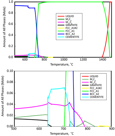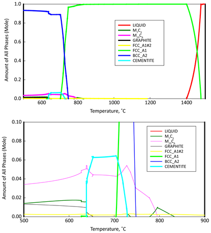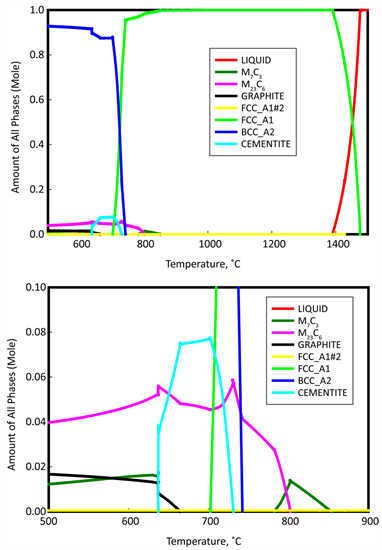 For steel grade 2 as illustrated in Figure 7, both FCC-A1#2 and M23C6 phases were began to grow at the expanse of dissolving both MC_ETA and M3C2 at 585˚C. MC_ETA phase completely was disappeared at 725˚C. At 767˚C MC_ETA was appeared again on the expanse of disappearing FCC_A1. Finally, MC_ETA disappeared at 900˚C and appeared at 912˚C and completely disappeared at 1000˚C.