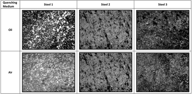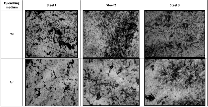 Figure 1. Microstructure of investigated steels after either oil quenching (from 850˚C) or air quenching (from 880˚C).