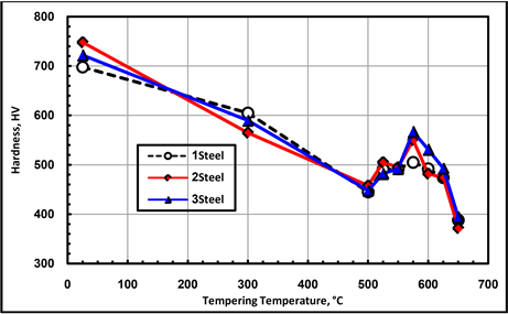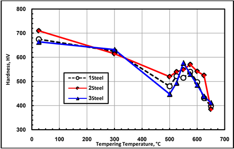 The results clarify progressive softening due to tempering of all investigated steels up to 500˚C. On the other hand, at higher temperature a distinct hardness peak is observed for each investigated steel at a definite tempering temperature, which should be attributed to the secondary hardening.