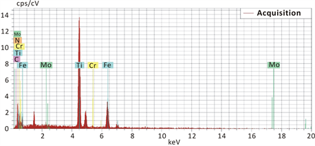 For steel 3, SEM results and EDX showed that there are carbides or carbonitrides of Type M7C3, (Fe, Cr, Mo, Ti)(C, N) as given in Figure 10 and Table 4.