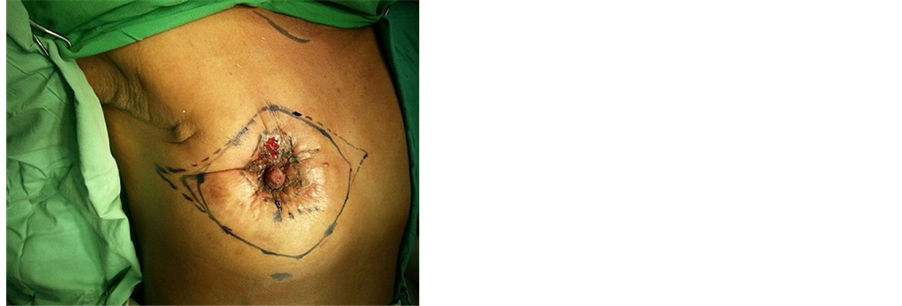 Physical examination revealed a large mass approximately 6 cm in diameter involving almost the entire right breast. The overlying nipple areola complex was scarred with evidence of ulceration (Figure 1). The mobility of mass within the breast and on the underlying muscle was restricted. Ipsilateral axilla did not reveal any lymphadenopathy clinically. Contralateral breast and axilla were normal. There was no evidence of cervical lymphadenopathy or spinal tenderness. Respiratory system did not reveal any abnormality. FNAC was done and confirmed the diagnosis of invasive ductal carcinoma. Special staining of the blood stained fluid from the ulcerated area revealed the presence of acid fast bacteria (Figure 2). Metastatic work up did not reveal any metastasis. Patient underwent two cycles of chemotherapy (CMF regime) preoperatively in order to downstage the locally advanced lesion. 25% regression in the size of the mass was observed after chemotherapy. Patient was then subjected to modified radical mastectomy with axillary clearance.