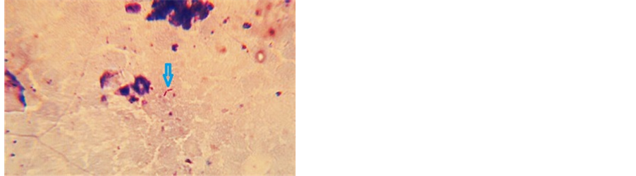 Figure 2. Acid fast bacteria marked by the blue arrow seen in the discharge from the ulcerated area (Zeihl Nelson staining, magnification ×100).