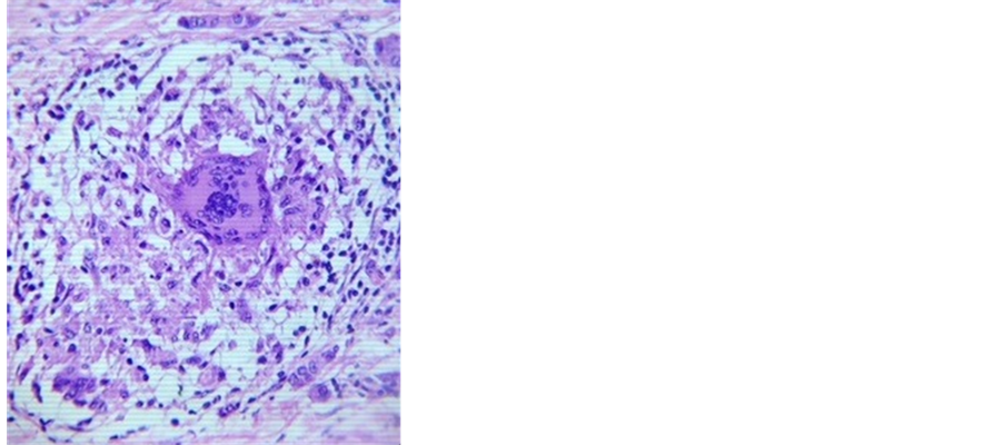 Histological evaluation of the specimen confirmed the diagnosis of invasive ductal carcinoma (Figure 3). However, in addition, granulomas comprising of outer rim of epitheloid cells typical of tuberculosis were seen in a few sections (Figure 4). Histopathological examination of axillary lymphnodes revealed positive evidence of metastasis in the lymph nodes. However there was no evidence of any granuloma. Post-operative recovery