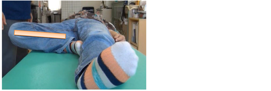 Figure 1. Before treatment, the angle between the bed and his right lower thigh was approximately 30˚ on abduction of the right hip joint.