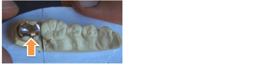 Figure 2. The gold alloy inlay (arrow) that was judged to be effective by the Bi-Digital O-Ring Test.