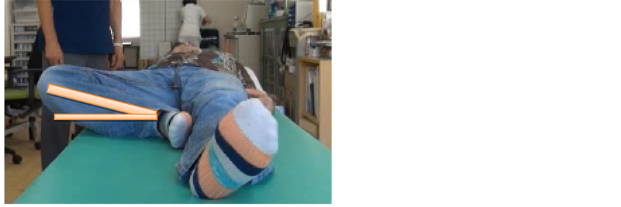 Figure 5. The angle between the bed and the subject’s lower thigh was almost 0˚ on placement of the inlay in the left lower second molar, and the subject felt neither pain nor stiffness in either of his hip joints.