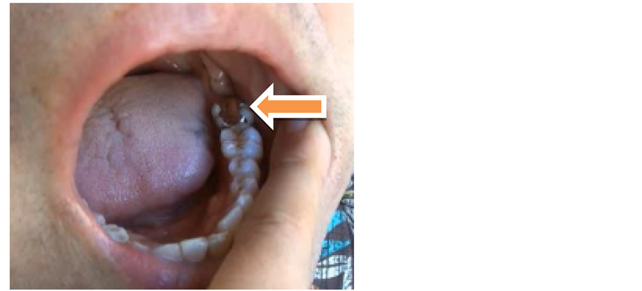 A gold alloy inlay (Au, 87.0%; Pt, 11.0%; and the rest, Zn and Ir) was created and was judged to be effective by the Bi-Digital O-Ring Test (Figure 2) [17] [18] as follows: First, the subject’s grip power decreased on stimulation of the hip joint [8] . Second, when the metal was set on his body, if his grip power did not decrease despite stimulation to the subject’s hip joint, the metal was judged to be effective. When the metal inlay was placed on his chest, the hip joint revealed greater flexibility, resulting in an angle of approximately 5˚ (Figure 3). However, some stiffness and pain still persisted. When the inlay was removed from the subject’s body, the subject’s leg returned to the initial position, and on placement in the left lower second molar (Figure 4), the angle decreased to almost 0˚ (Figure 5) and neither pain nor tension remained.