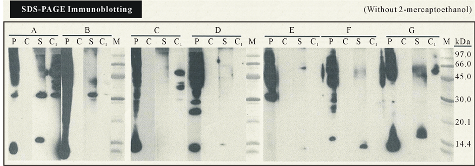 SDS-PAGE immunoblotting performed with wheat, barley, rye, oat, rice, corn and gluten, showed low molecular weight IgE binding bands (around 14 kDa). As shown in Figure 1 (immunoblot with electrophoresis done under non-reducing conditions), the bands in the samples of wheat, barley, rye, oat, and gluten, may represent α-amylase/trypsin inhibitor family proteins.