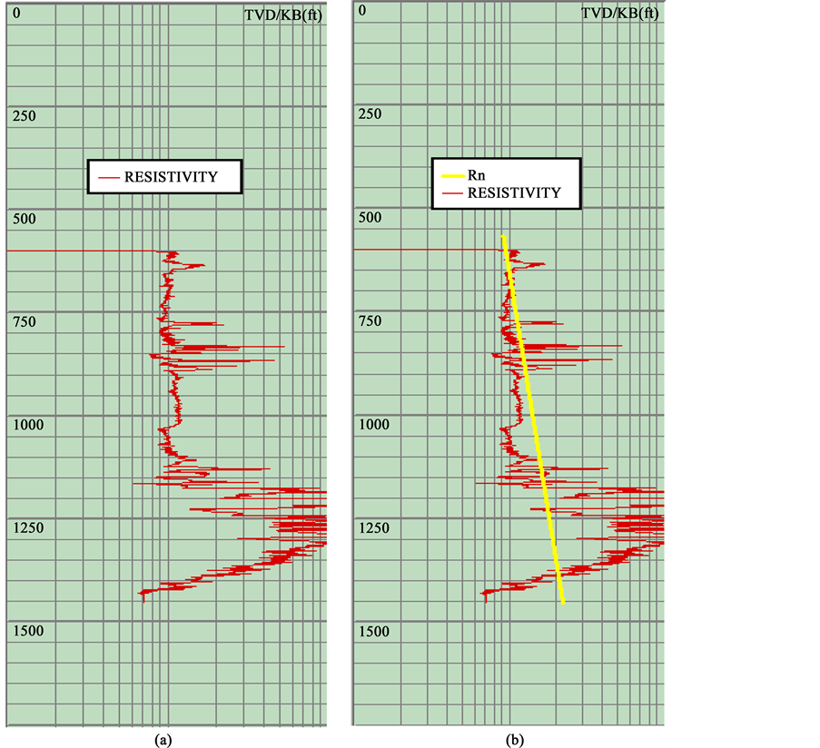 Figure 3. (a) Resistivity of case 1; (b) Normal resistivity of case 1, which the red curve, represents the resistivity versus depth, while the yellow straight line represents the normal resistivity and it best fits the shallow depth to represent the normal pore pressure.