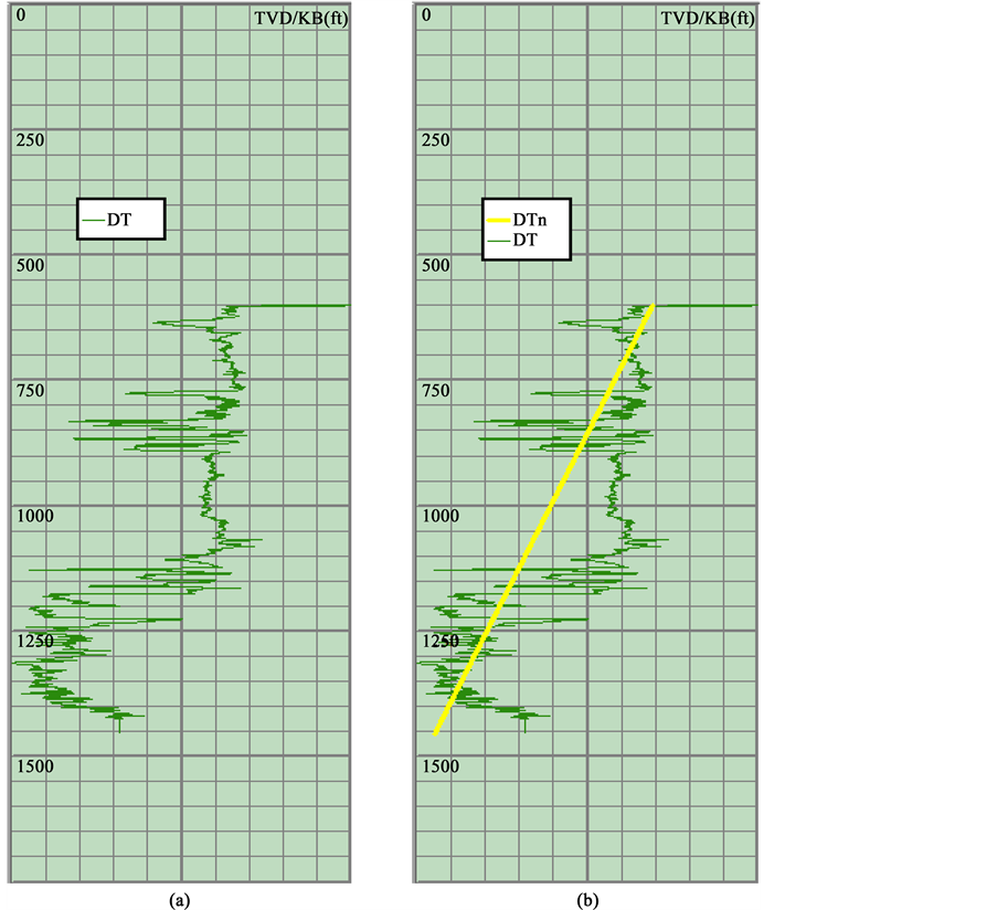 Figure 5. (a) Sonic Log Data of LAGIA -8 well; (b) The green curve represents the transient time versus depth, while the yellow straight line represents the normal transient time and it best fits the shallow depth to represent the normal pore pressure.