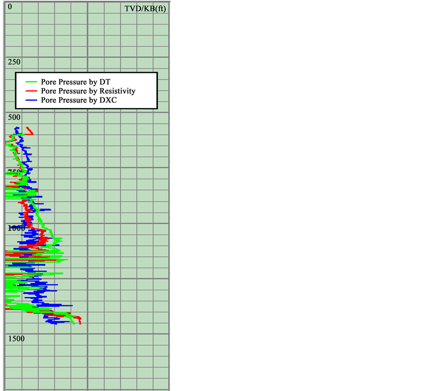 Figure 7. Comparison between pore pressure from three different methods such as D-exponent, resistivity and transit time.