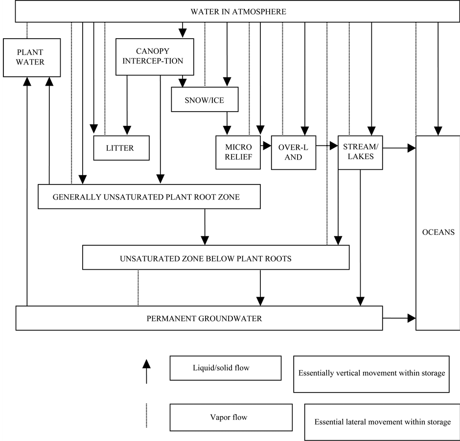 Hydrology is the inter-disciplinary science that deals with all waters of the earth, including their origin, occurrence, circulation and distribution on and in the earth, their chemical and physical properties, and their reactions with their environment, including their relations with living things. The scope of hydrology, therefore, encompasses the full history and behaviours of water in the earth system. Hydrology is defined as the science of the water of the earth, its distribution, composition and movement. It can also be defined as the science of the earth’s water and its motions through the hydrological cycle [21] [22] . Below is the schematic diagram of the hydrological cycle or system to show various component of storage and fluxes of flows